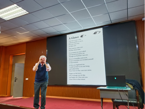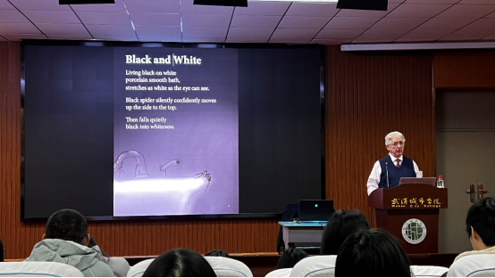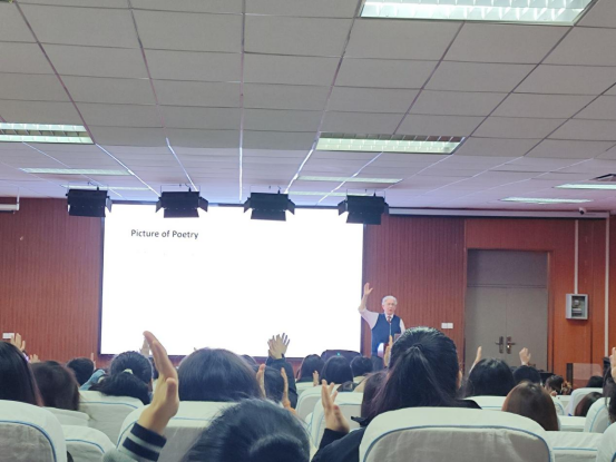 上午,南1楼2号报告厅座无虚席,二百多名学生欣赏了教授用英语写的诗歌,在教授的讲解中学习如何用英语选词表达情感与叙事。同学们时而跟读,时而讨论,时而发出大笑,最后用英语踊跃提问,气氛十分活跃。