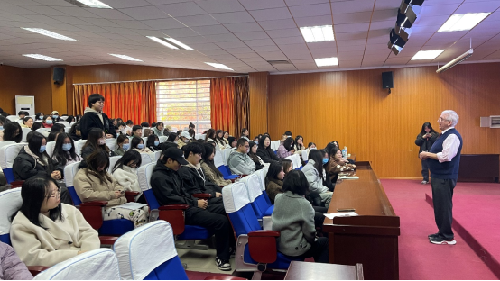在提问过程中,同学们问及教授与妻子(一位北京人)的恋爱经过、在美国的生活等。会后很多同学表示意犹未尽,积极地和教授交流分享自己的故事。